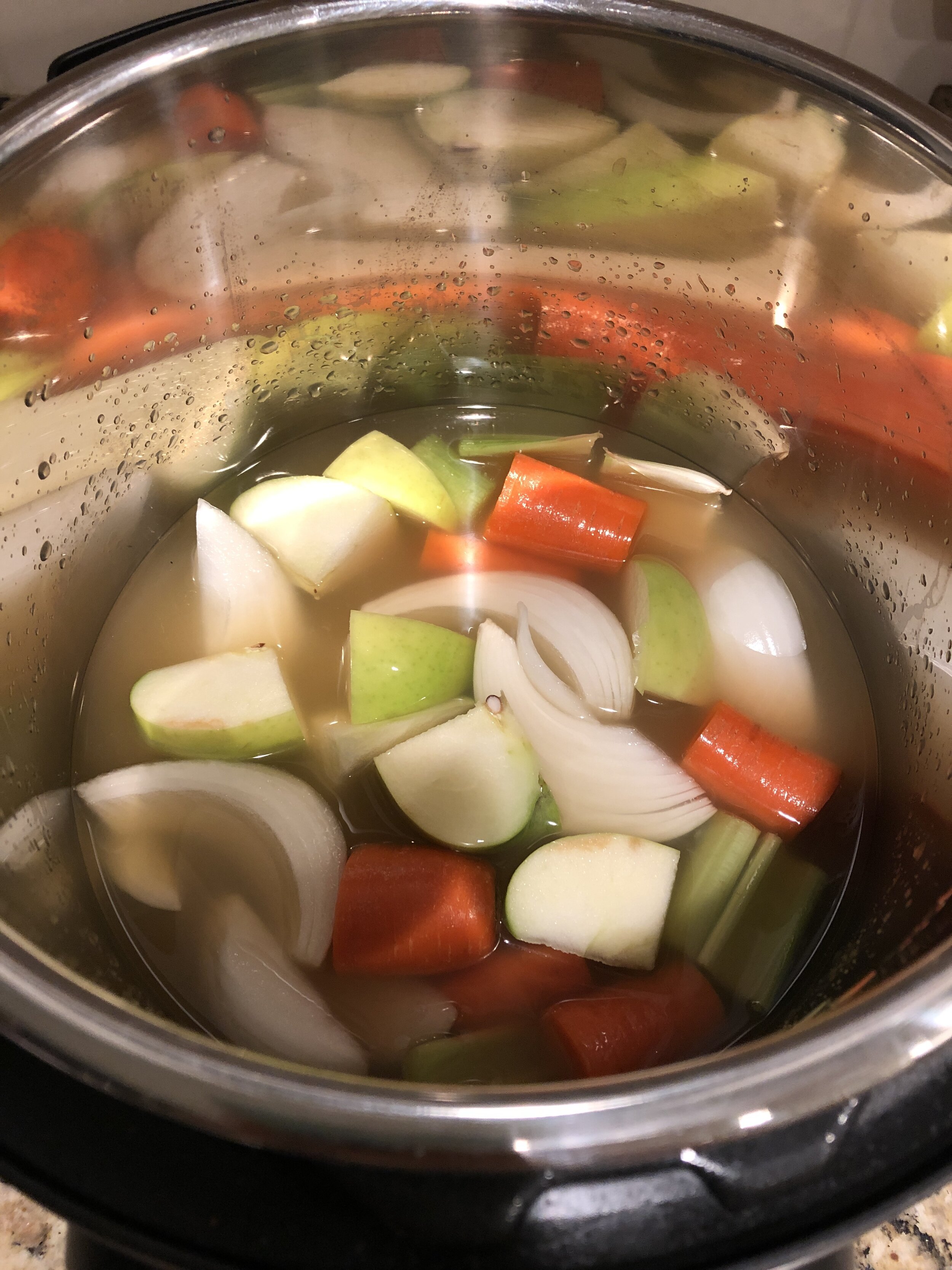 In the meantime, roughly chop up the carrot, celery, apple and onion. Place at the bottom of the Instant Pot, then add two cups of chicken broth.
