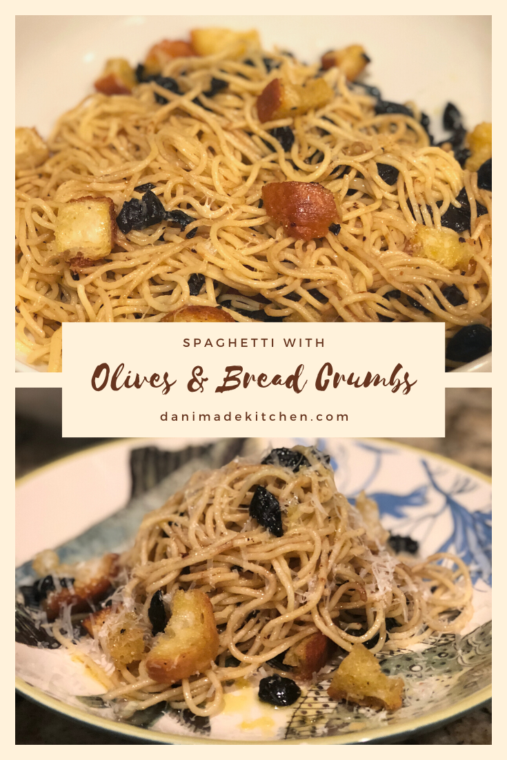 When the pasta is al dente, drain and transfer into the large skillet with olive and bread mixture. Drizzle with more olive oil, toss well until everything is combined.