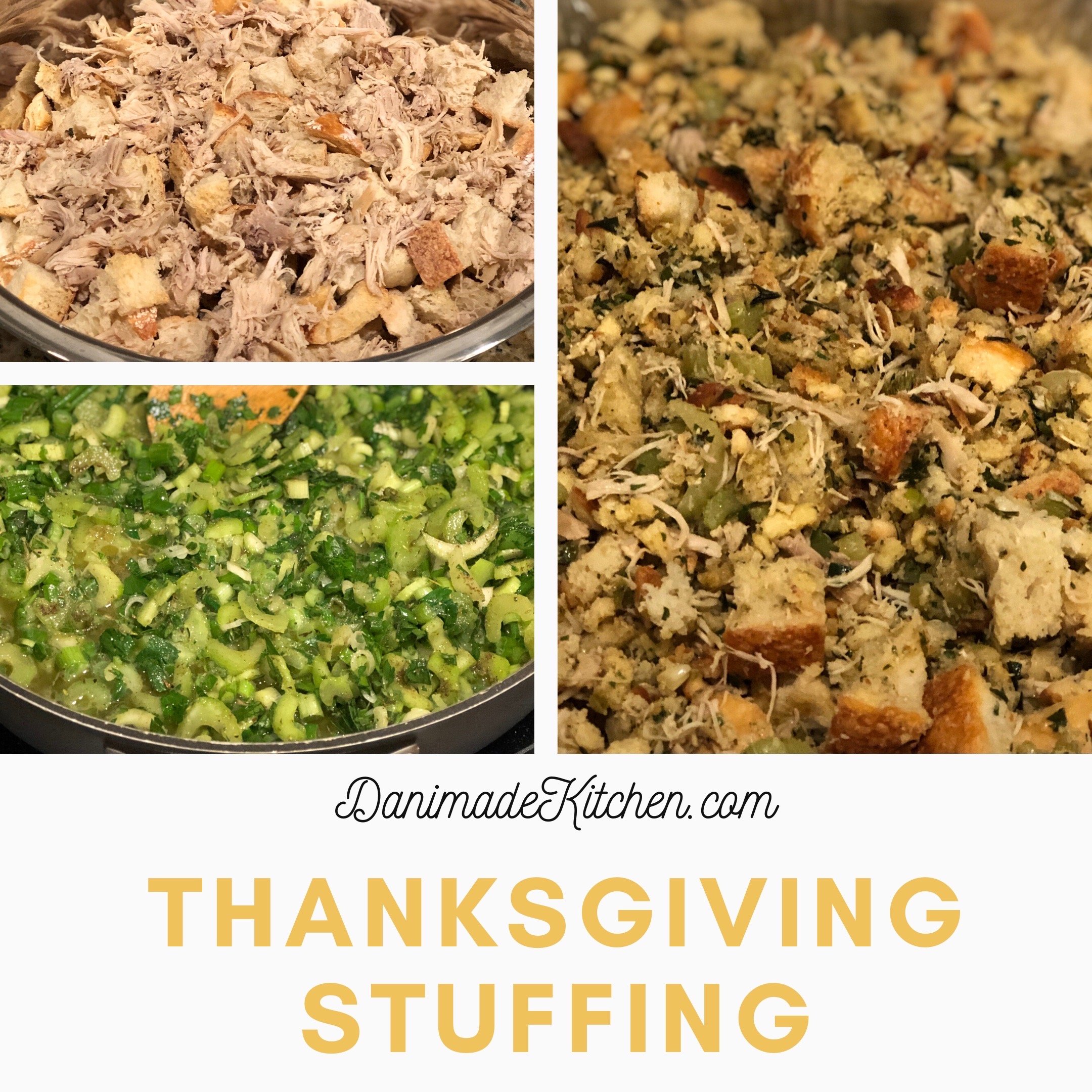 Use a spatula to pour the entire mixture over bread cubes, clean out the pan so all the drippings go onto the bread. Then, add the chicken and broth mixture. Start to toss to combine well. Little by little, add broth if it is dry. Use enough to get them wet, but not soaked. The mixture should definitely be moist. It shouldn’t look like it is swimming in the broth, but just wet enough.