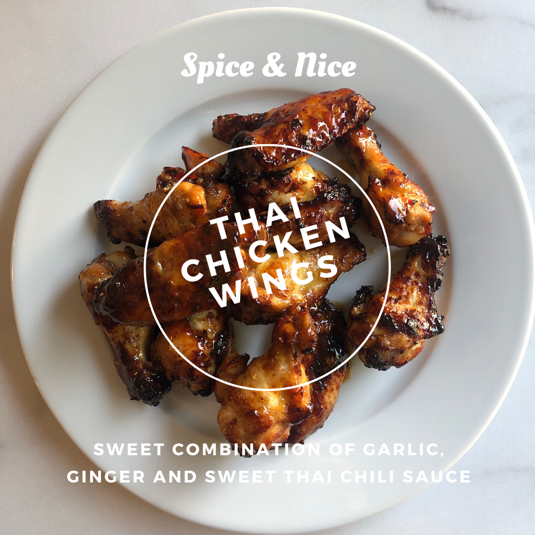 Once wings are cooked, place in a clean, large mixing bowl and toss with sweet Thai chili sauce. Serve hot.